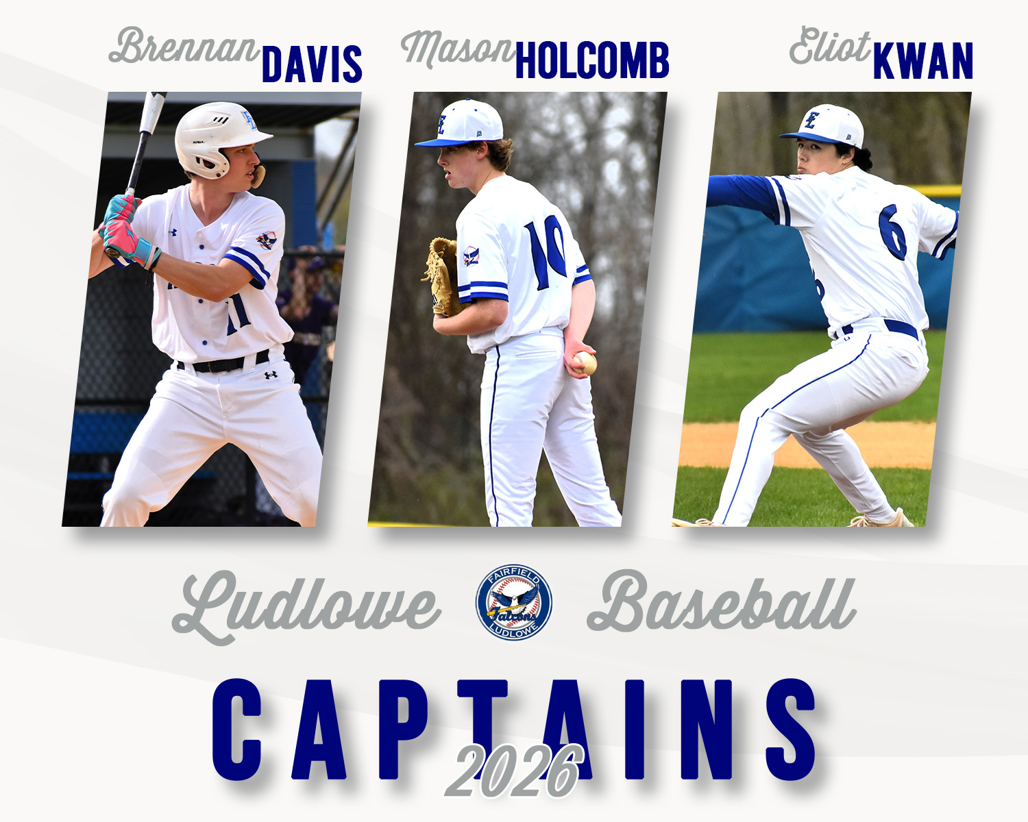 Congrats to Brennan Davis, Mason Holcomb and Eliot Kwan on being named captains for the 2026 season! We are excited for you to be leaders for us on and off the field! #LudloweBase #FalconPride